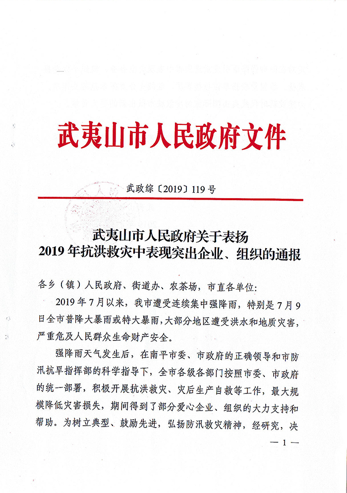 武夷山市政府关于表扬2019年抗洪救灾中表现突出企业组织的通报