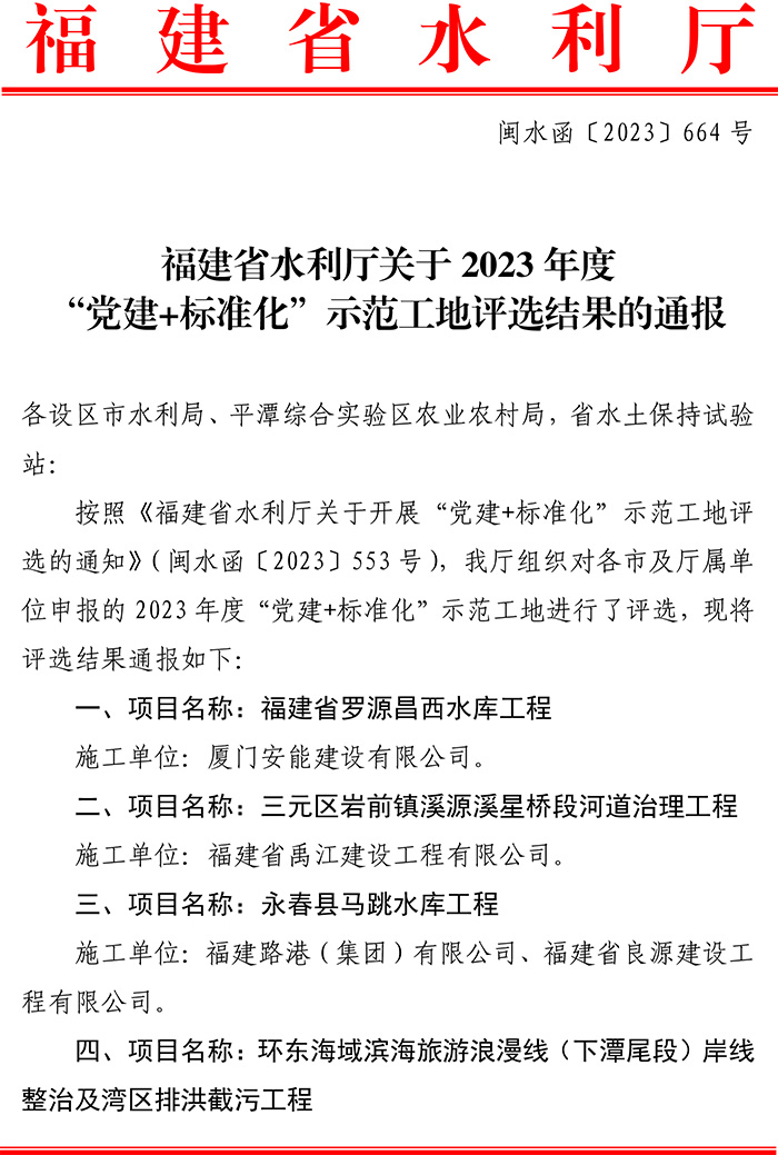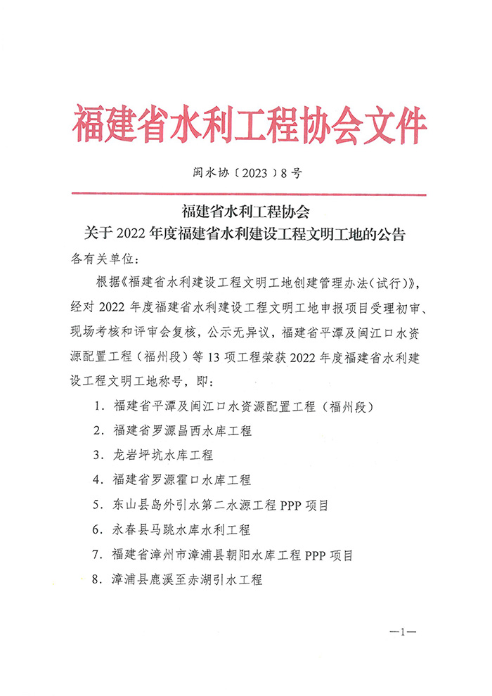 2022年度福建省水利建设工程文明工地